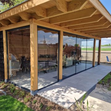 Glazen schuifwanden voor een houten overkapping